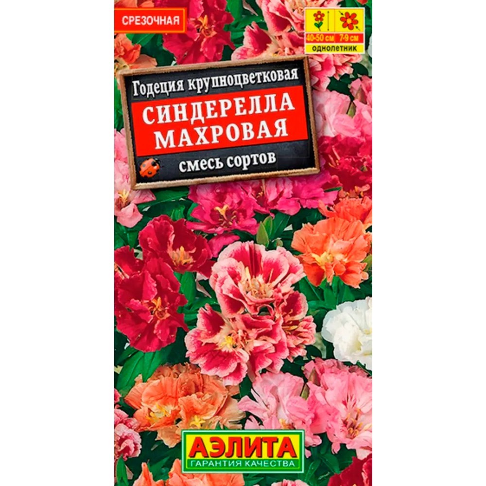 Однолетник. Высота 60 см. Диаметр 8 см. Цветущий куст годеции Синдерелла напоминает шикарный букет. Это изящное, стройное растение, до 60 см высотой, с густой листвой и крупными, ? 7-9 см, махровыми цветками с шелковистым блеском. Без труда впишется в любой садовый ансамбль, – украсит рабатки, клумбы, миксбордеры. Отлично смотрится в отдельных групповых посадках. Можно выращивать в уличных контейнерах, подходит для срезки в букеты.