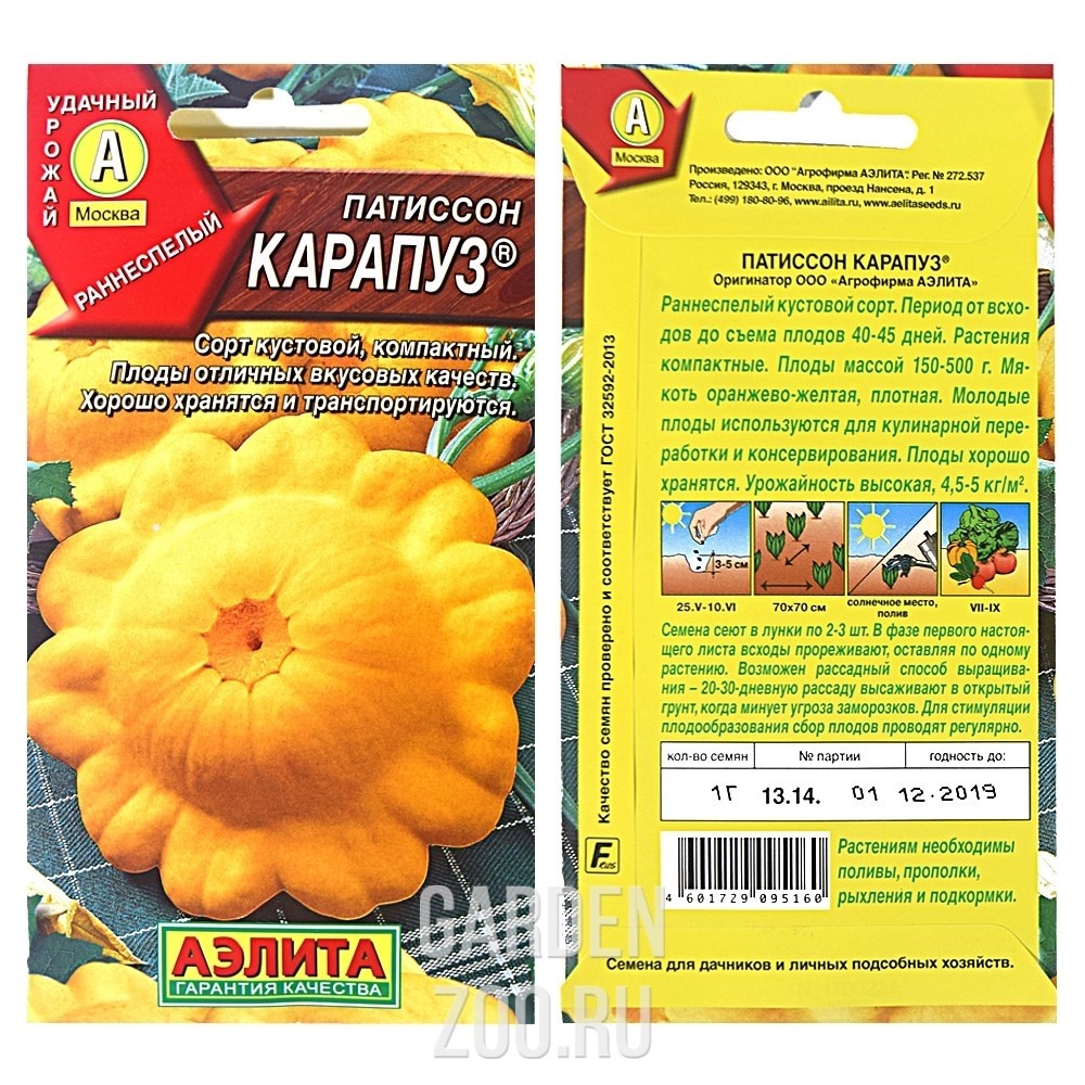 Кустовой раннеспелый сорт. Период от всходов до съема плодов 45-50 дней. Урожайность высокая, 4,5-5кг/м2. Растения компактные. Плоды тарелочной формы, массой 150-500 г. Мякоть оранжево-желтая, плотная, нежная. Используется для кулинарной переработки, подходит для консервирования. Плоды хорошо хранятся после съема и транспортируются.
