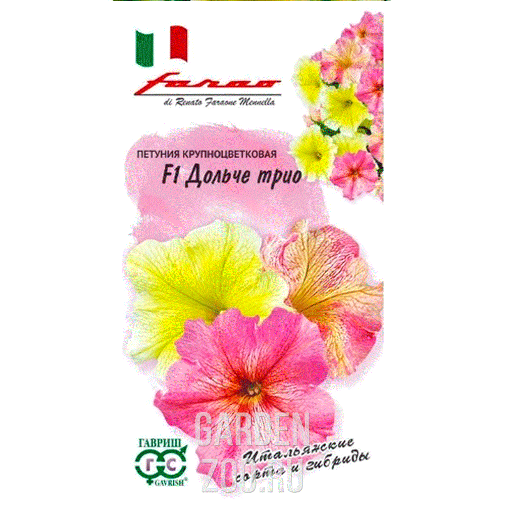 Очаровательная смесь из трех крупноцветковых гибридов серии «Дольче», которая славится невероятно нежными пастельными оттенками, редко встречающимися среди петуний. Из-за неравномерного окрашивания (тона переходят из более насыщенных и плотных в более светлые и легкие) цветки кажутся воздушными, полупрозрачными, будто сияют, пропуская солнечный свет. Эффект усиливает ярко-выраженное жилкование, интенсивность которого меняется от цветка к цветку. Растение образует аккуратные кустики высотой 20-30 см, усыпанные цветками диаметром 7-8 см. Гибриды неприхотливы, обильно цветут и даже в ненастную погоду сохраняют свою привлекательность. Посев проводят поверхностно, под стекло, с февраля по март. После появления всходов стекло убирают. При зимнем посеве всходам необходима подсветка. Всходы появляются через 7-12 дней. На постоянное место высаживают, когда минует опасность заморозков. Цветет с конца мая весь сезон. Светолюбива и достаточно засухоустойчива. Предпочитает легкие, плодородные, хорошо дренированные почвы. Украсит клумбы, вазоны, балконные ящики, подоконники, низкорослые бордюры. Рекомендуется для профессионального озеленения и выращивания на продажу.