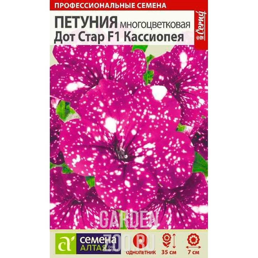 Неведомые тайны космоса на вашем участке – уникальные гибриды новейшей серии низкорослой многоцветковой петунии «Дот Стар F1». Растения формируют кустики высотой 30-35 см, отлично ветвятся, характеризуются ярким обильным цветением. Сочетание насыщенных окрасок и белых крапинок придает цветкам необыкновенно привлекательный вид. Серия отличается высокой устойчивостью к неблагоприятным погодным условиям: после сильного дождя растения быстро восстанавливают свой внешний вид. Светолюбивое и достаточно засухоустойчивое растение. Предпочитает легкие плодородные, хорошо дренированные почвы. Посевы на рассаду проводят с середины февраля. Семена равномерно распределяют по поверхности субстрата, не заделывая, а лишь слегка вдавливая в грунт. Для получения наилучшего результата посев рекомендуем проводить в торфяные таблетки (одно драже в таблетку). Посевы увлажняют из распылителя и накрывают стеклом для поддержания постоянной влажности. Емкость помещают в светлое теплое место (+22-24°С). Всходы появляются через 10-15 дней, стекло убирают. Февральским посевам требуется дополнительная подсветка. Пока всходы мелкие, их лучше не поливать, а опрыскивать, избегайте попадания на них прямых солнечных лучей. Пикировку проводят в фазе 1-2-х настоящих листочков. В открытый грунт рассаду высаживают в конце мая - начале июня, когда минует угроза возвратных заморозков. Посадочный интервал – 30-40 см. Обильное и продолжительное цветение с июня до осенних заморозков. Возможно сохранение растений зимой в освещенном помещении при температуре около +12°С с предварительной обрезкой побегов. Внимание! Семена дражированные - оболочку драже не разрушать!