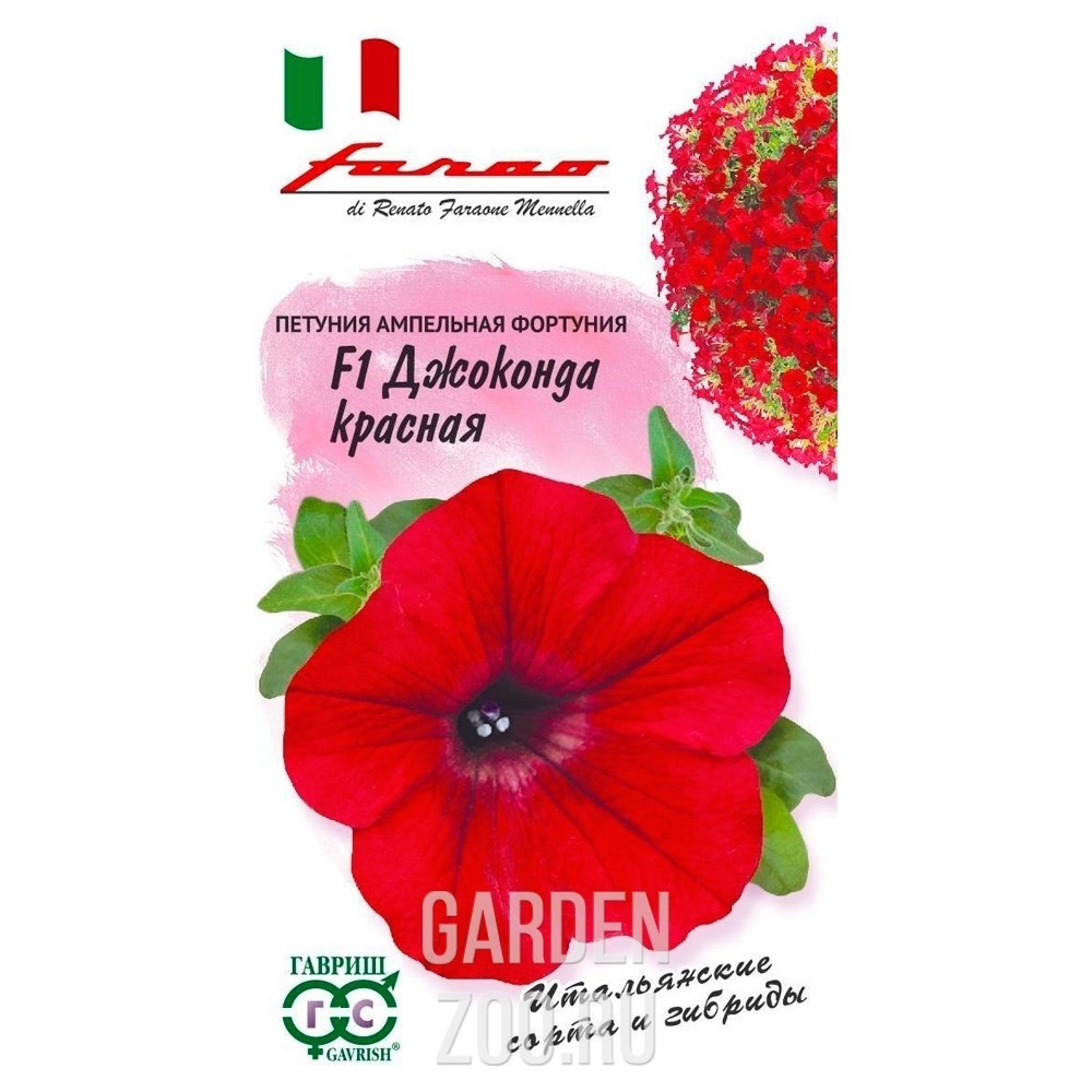 Уникальные гибриды итальянской серии «Джоконда» формируют поразительно мощный каскад из зелени и огромного количества цветов. Они превосходят все известные каскадные формы по многим параметрам, включая «сурфинию». Одно растение обладает такой скоростью и силой роста, что быстро заполнит пространство диаметром 1 м. Цветение настолько обильное, что практически не видно зелени и количество цветков не меняется с начала цветения до заморозков. Габитус растения зависит от плотности посадки. При высадке на расстоянии 30 см, растут, в основном, вверх, образуя «подушку» из красных цветков высотой 20 см. Крепкие стебли позволяют поддерживать форму в течение всего сезона. Высаженные на расстоянии 60 см, разрастается как почвопокровные во всех направлениях на площади 1 м². Но эффектнее всего выглядят растения в подвесных корзинах и балконных ящиках, где мощные многочисленные побеги длиной 80-100 см, свисая, образуют грандиозный цветущий водопад. Выращивают рассадным способом. Посев проводят с января по апрель, поверхностно, под стекло (после появления всходов стекло убирают). В зимние месяцы январь-февраль досветка обязательна. При ранних сроках посева цветение начинается в мае. Без дополнительного освещения петунию высевают не раньше марта. Всходы появляются через 7-12 дней. На постоянное место высаживают, когда минует опасность заморозков. Светолюбива и достаточно засухоустойчива. Предпочитает легкие, плодородные, хорошо дренированные почвы.
